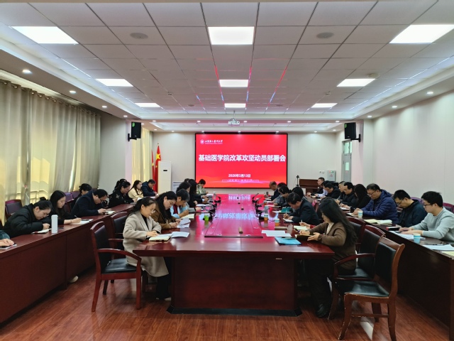 3月13日上午,基础医学院召开改革攻坚工作动员部署会,统一思想、凝聚共识、明确任务、压实责任,吹响学院改革攻坚、高质量发展的冲锋号。基础医学院院长丁怡作动员讲话。会议由学院党委书记楚新艳主持,学院领导班子成员、各党支部书记、各科室负责人等参会。