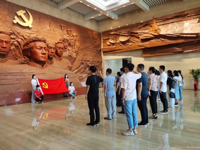 在展馆序厅,面对鲜红的党旗,全体党员庄严地重温了入党誓词,铿锵承诺,体现出党员同志们对党的无限忠诚,不忘初心使命、坚定理想信念的决心。