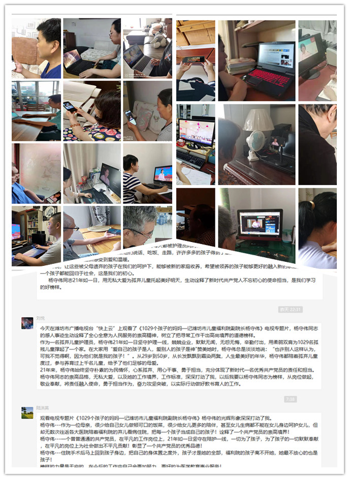 近日,形态机能实验室党支部组织全体党员和非党员教师通过潍坊电视台“快上云”观看了《1029个孩子的妈妈-全国优秀共产党员、潍坊市儿童福利院副院长杨守伟》,学习了杨守伟同志的先进事迹,并在线上线下展开了讨论。